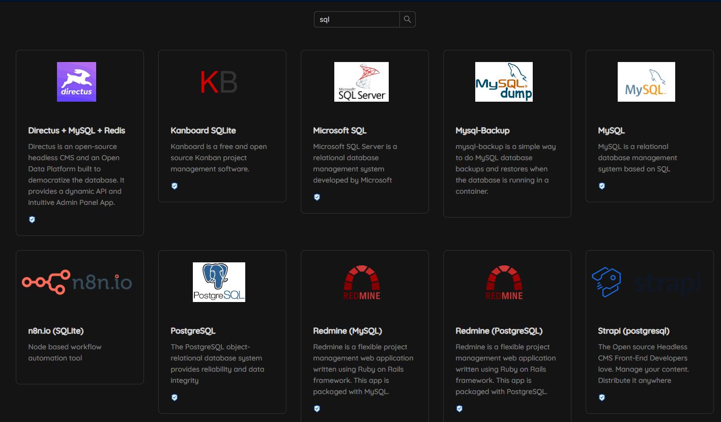 在此頁面點選按鈕**[One-Click Apps/Databases],內有許多可以一鍵安裝的服務,比如說想要安裝資料庫,搜尋sql出現各種各種資料庫服務,MsSql、MySql、PostgreSQL、MongoDb等等主流資料庫,用內建的一鍵安裝可以非常輕鬆的就可以建立一個服務。可以看看有沒有適合的服務可以安裝,如果沒有,也可以後續安裝dockerhub的服務。